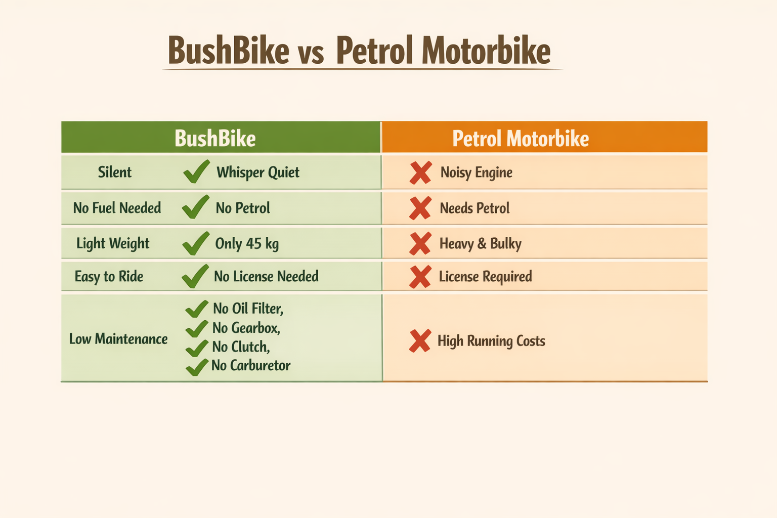 We offer a practical range of BushBike accessories to match different work and lifestyle needs: our heavy-duty rear carrier (75 kg payload) is perfect for hauling boxes, tools, wire, farm equipment, bags of fodder, or other luggage. For tourism and everyday use, our canvas bags keep essentials close—think a camera, snacks, and drinks on a day ride. Going off-grid is easy with solar charging: the BushBike can be charged from 12–24V DC with no inverter needed, making it ideal for farms, lodges, and remote areas. When you need more volume, our trailer can pull up to 150 kg—great for bedding, water, or farm “room service” runs. For business deliveries, the delivery box is a solid fit for delivery services, pizza, and restaurants, and the passenger seat turns the BushBike into a practical taxi option for safely transporting people.