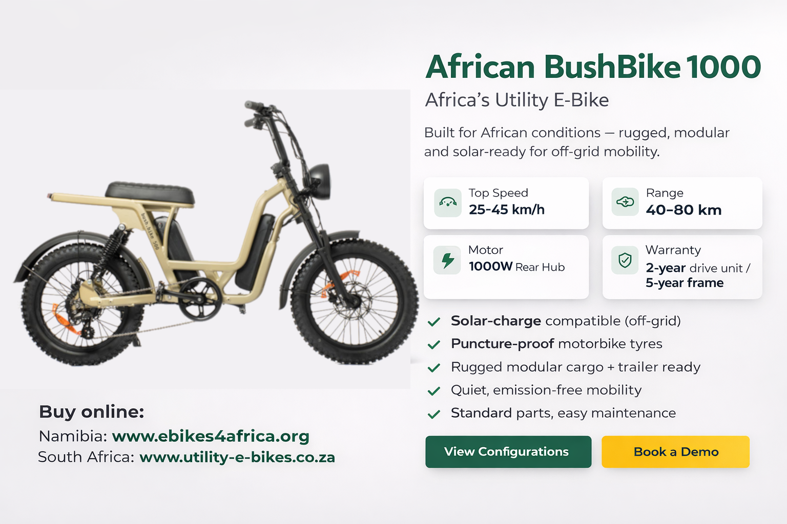 The African BushBike is designed for daily use in the toughest environments — from farm runs to city deliveries. With a robust aluminum frame, powerful motor, and modular cargo options, it's built to carry, last, and perform.